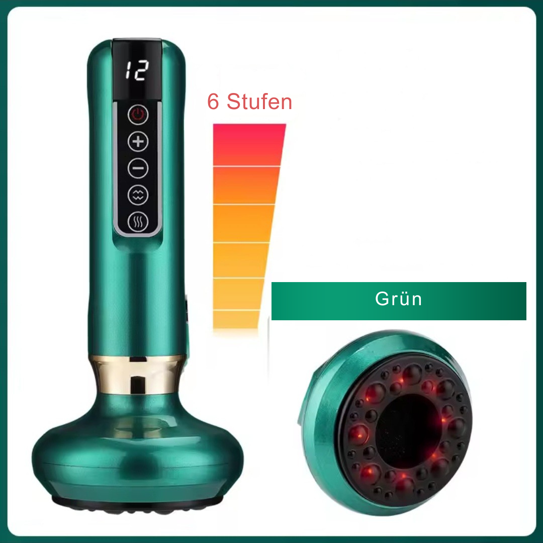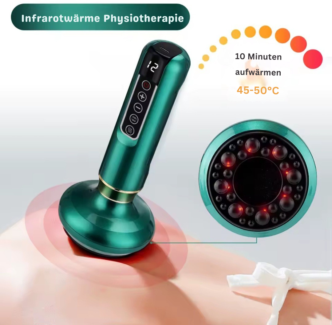 Das elektrische Schröpfgerät kombiniert Vakuum-Massage, Tiefenwärme und negative Drucktherapie, um die Durchblutung zu fördern, das Bindegewebe zu straffen und das Erscheinungsbild von Cellulite sichtbar zu reduzieren.